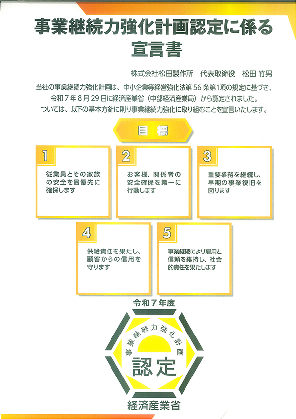当社の事業継続力強化計画は、令和7年8月29日に経済産業省(中部経済産業局)から認定されました。
